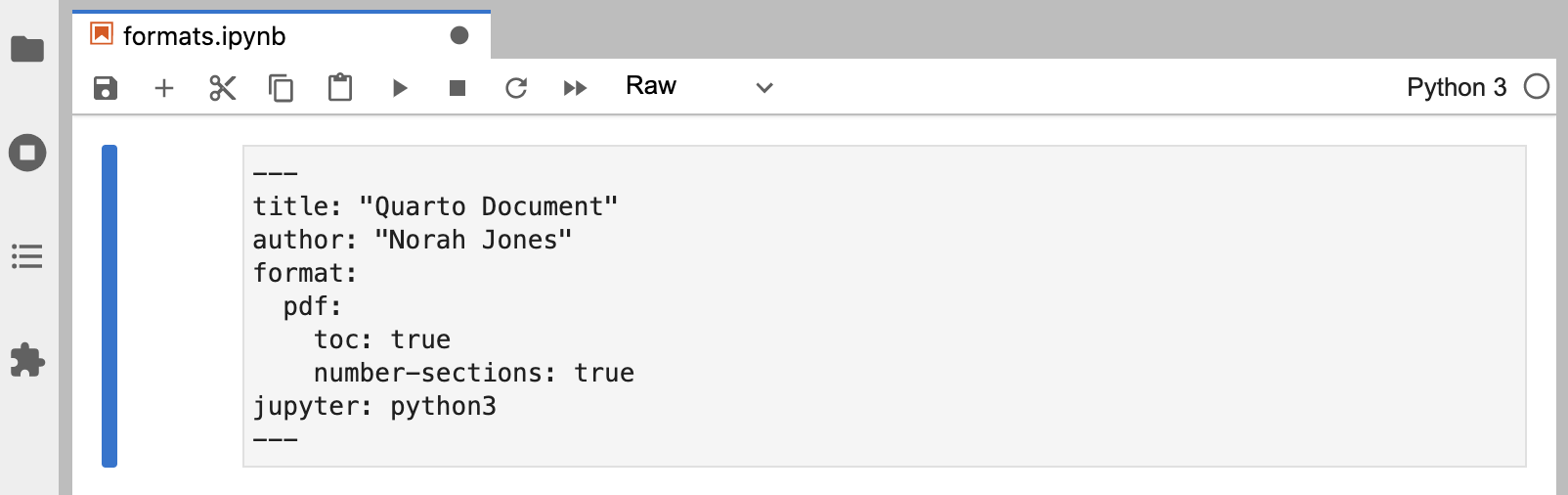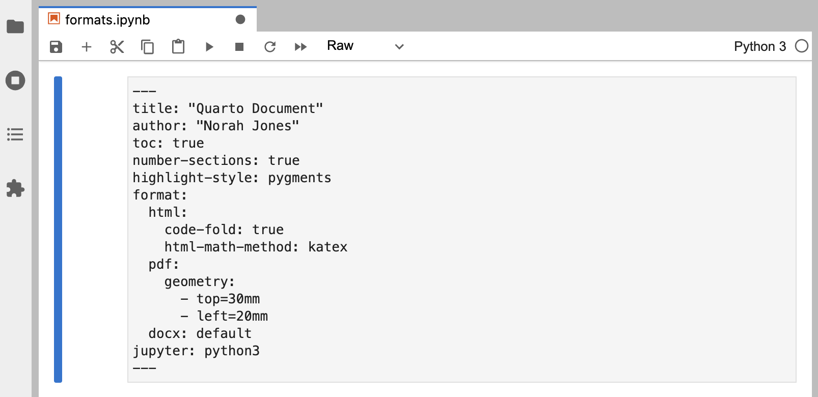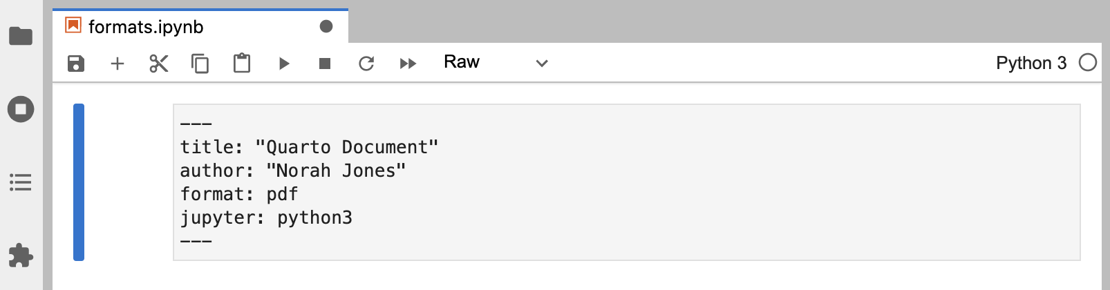 Let’s create a notebook and define various formats for it to be rendered to and add some options to each of the formats. As a reminder, document options are specified in YAML within a “Raw” cell at the beginning of the notebook. To create a Raw cell, add a cell at the top of the notebook and set its type to Raw using the notebook toolbar: